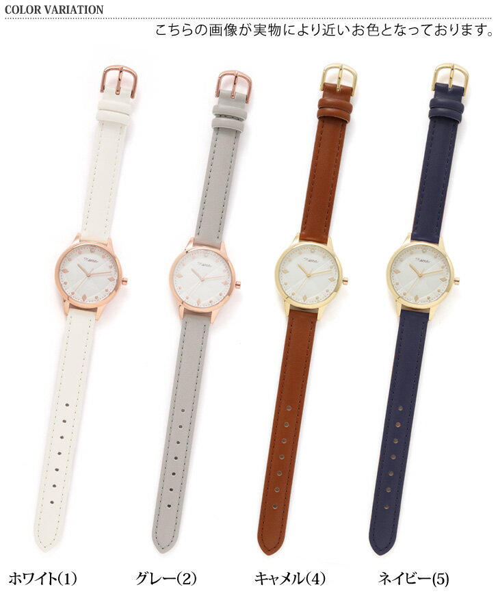 ▼メーカー希望小売価格はメーカー商品タグに基づいて掲載しています ←クリックで拡大します●パール感を含んだ文字盤とさりげないラインストーンが高級感を演出 ■サイズ:厚み約0.8cm ベルト幅約1.2cm 重さ約21g 全長約22cm ■生産:中国製 ※ムーブメントは日本製 素材 合金、合成皮革 カラー ホワイト(1)(標準的な白)グレー(2)(薄い灰色)キャメル(4)(明るい茶色)ネイビー(5)(濃いめの紺色) 上記サイズ表はスタッフが採寸し、製品の実寸を掲載しております。